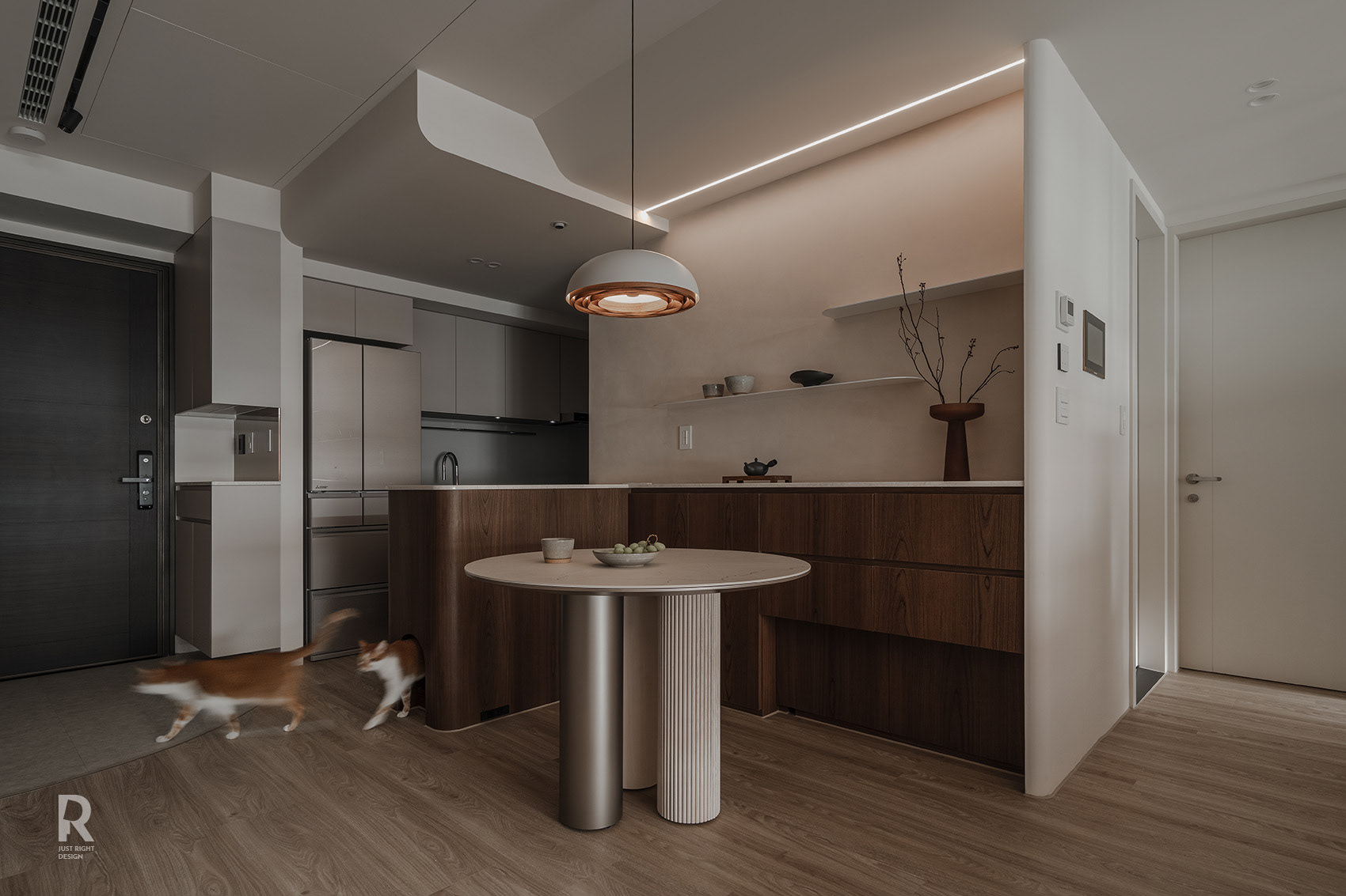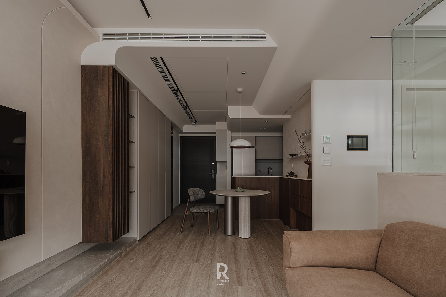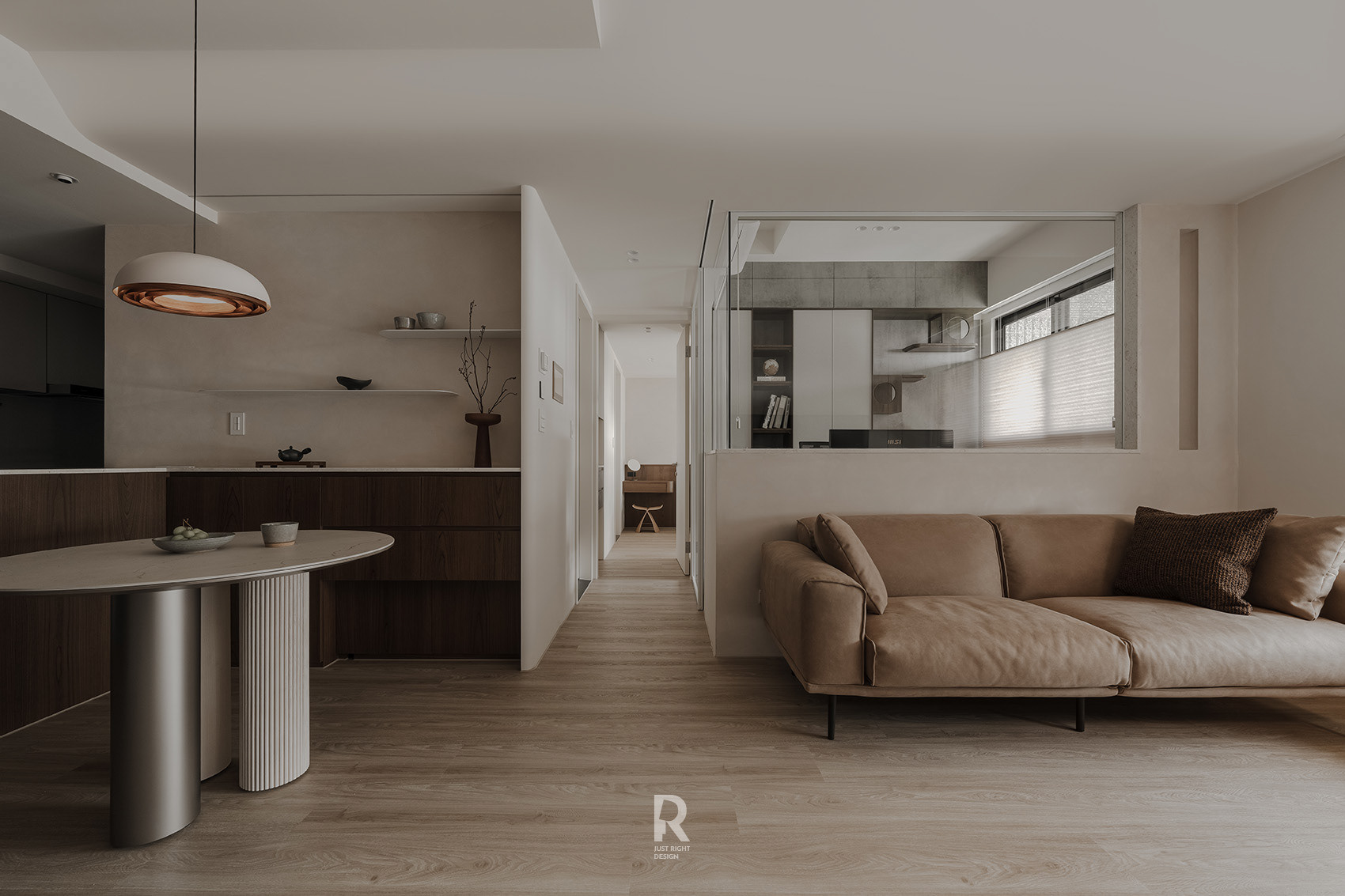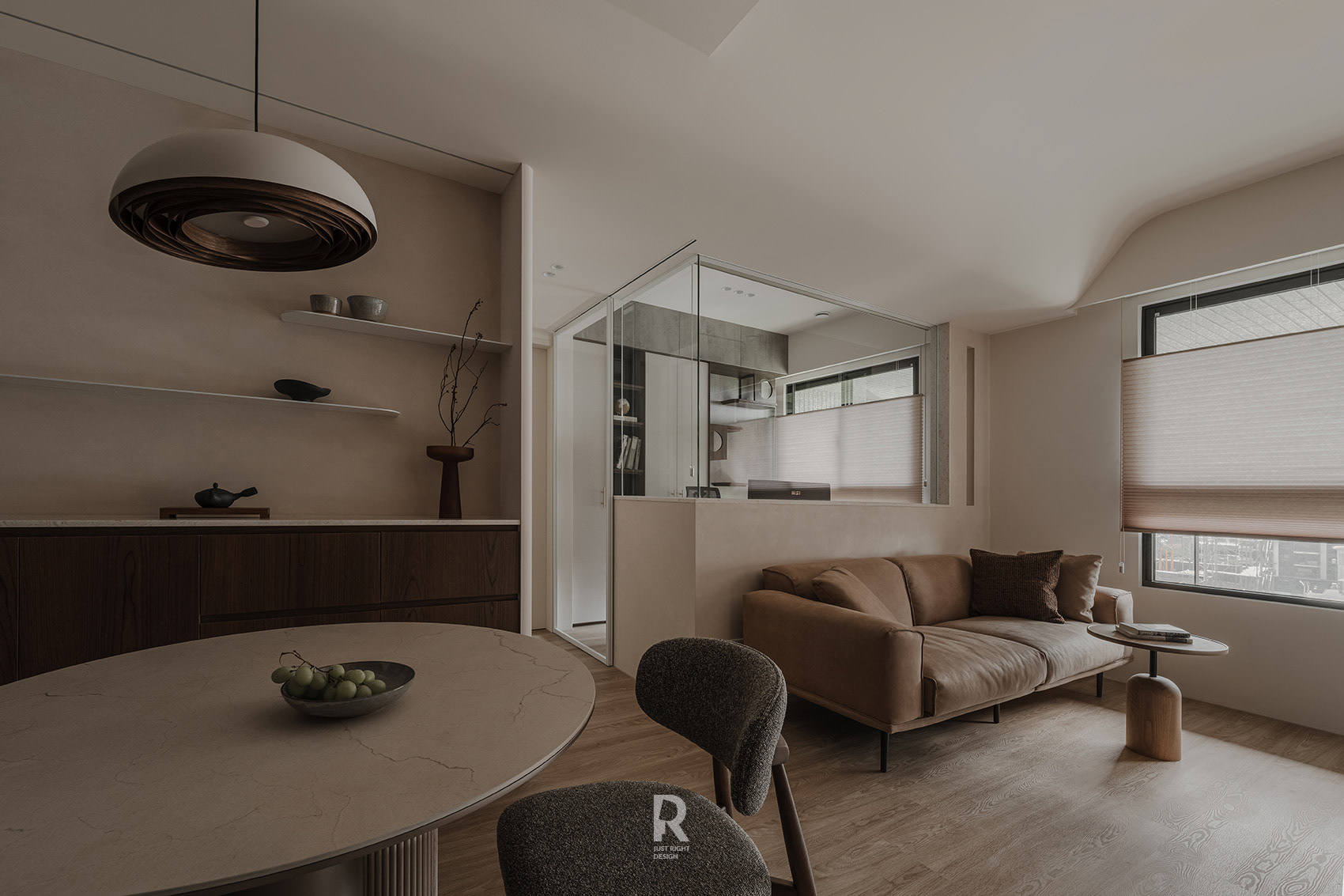 「潤」象徵光與質地之間的柔和流動。這個位於台中北屯的兩房住宅,以米白與胡桃色為主調,讓光影成為空間的語言。牆面與家具以克制的線條構築平靜節奏,柔和的反射如同呼吸般隱現,讓日常回歸純粹。這是一場關於留白、平衡與感知的對話,在靜默中展現生活的深度與溫度。