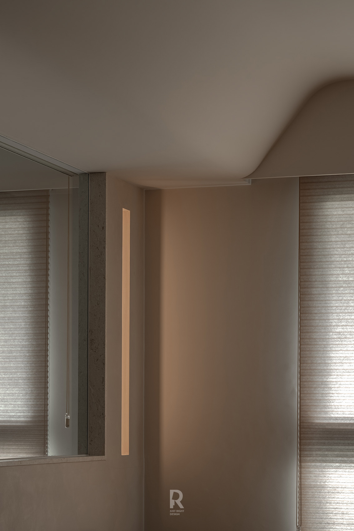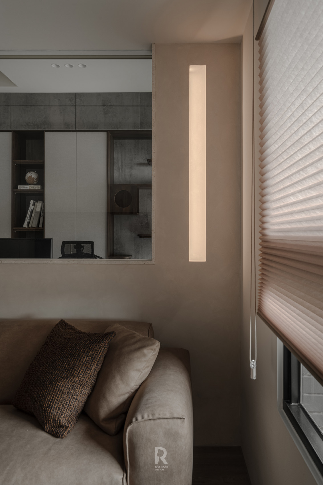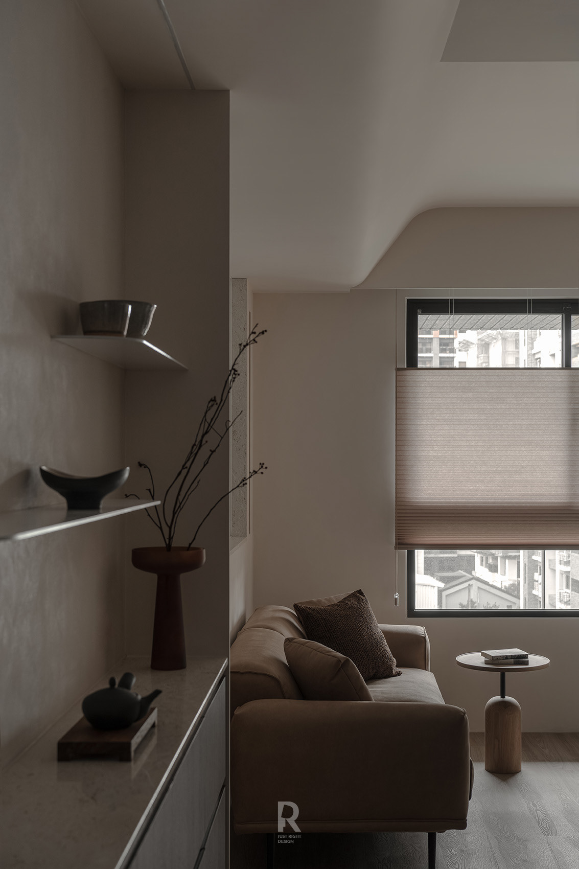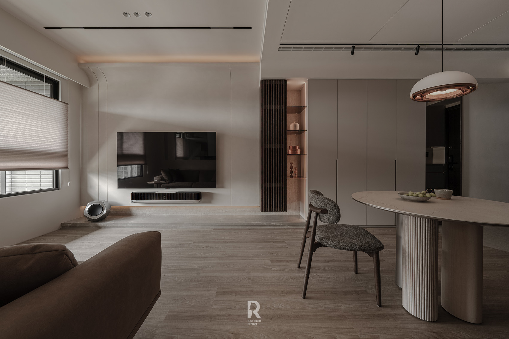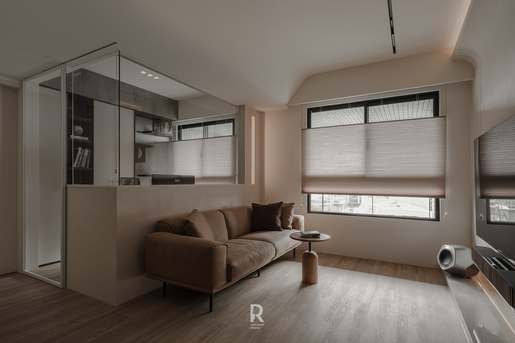 「潤」象徵光與質地之間的柔和流動。這個位於台中北屯的兩房住宅,以米白與胡桃色為主調,讓光影成為空間的語言。牆面與家具以克制的線條構築平靜節奏,柔和的反射如同呼吸般隱現,讓日常回歸純粹。這是一場關於留白、平衡與感知的對話,在靜默中展現生活的深度與溫度。